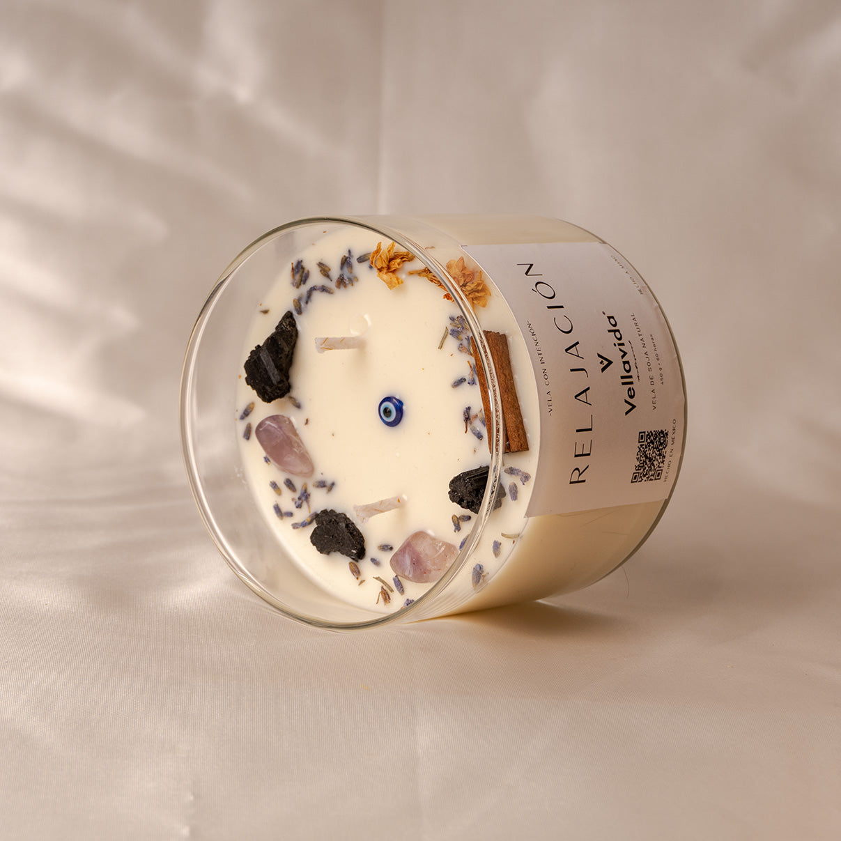 Disfruta de la serenidad con nuestra VELA RELAJACIÓN. Hecha a mano con 100% cera de soya y cuarzos, esta vela perfumada de 500ml contiene flores secas naturales para una experiencia sensorial única. Enviamos a todo México para que puedas disfrutar de su aroma exclusivo en cualquier momento.